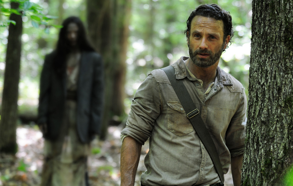 Meanwhile, Rick goes beyond the fences to check the hunting traps and comes across a woman on her own. She’s surviving alone with her husband who is “sick” and persuades Rick to come back to their camp with her in hopes to join the survivors at the prison. Spoiler alert: she’s crazy and her husband is a walker she’s trying to feed Rick to.